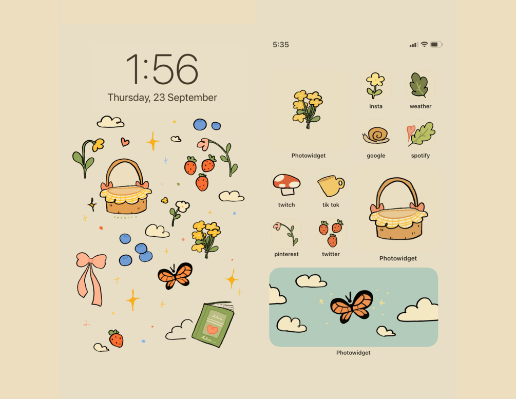 this icon pack includes 4 wallpaper designs, 25 icons, and 5 different widget designs (all assets come with white/beige/green colour variants)