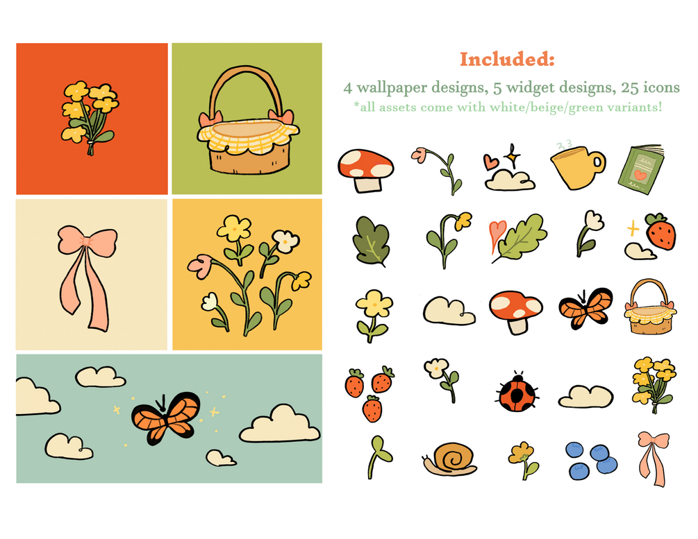 this icon pack includes 4 wallpaper designs, 25 icons, and 5 different widget designs (all assets come with white/beige/green colour variants)