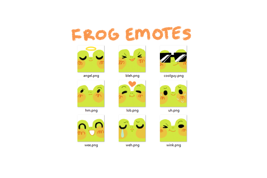 some cute frog faces - includes 9 emotes to express how ur feeling in ur discord servers 🐸 (112px .png and 600px .png files included)